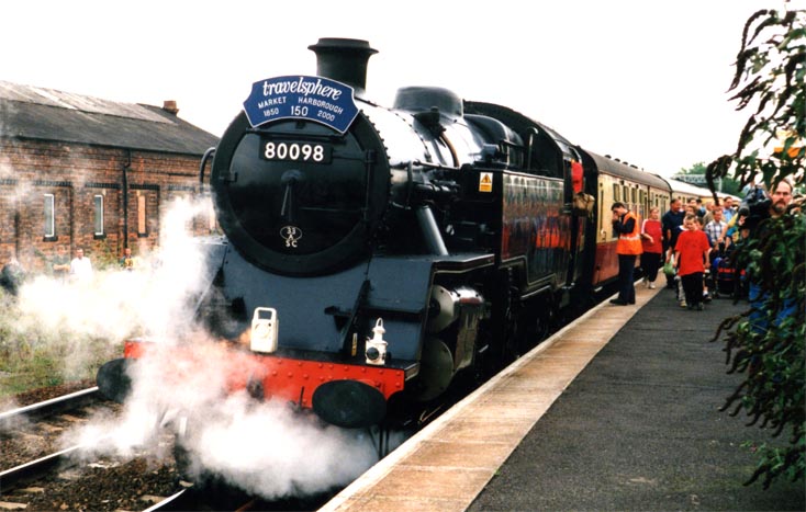 This train was on Sunday 17th Sepember 2000 with BR Class 4MT 2-6-4T no 80098. It was (booked) to be Steam hauled from Northampton to Leicester. Then from Leicester to Kettering.Then from Kettering to Melton Mowbray. Then it did Melton Mowbray to Kettering (twice). The train returning then from Kettering back to Nuneaton.
