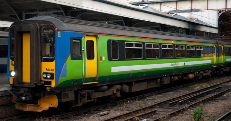 "National Express East Anglia class 156 in Norwich Station in Central Trains green. After the Central trains logos have been removed just a white stripes with "National Express East Anglia logo has been added.I think this may be 156412 or 156418 it had left befor I could see the number.