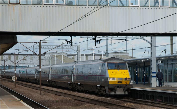 East Coast class 91127 at the rear of a train to Kings Cross in the new platform 3, which on the up fast on the 21st February 2014.