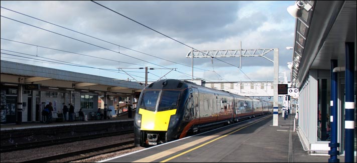 With men still working on the track around the station this class 180 was not flat out. I do not know what speed they will do when the station is done. The up fast was 111mph.