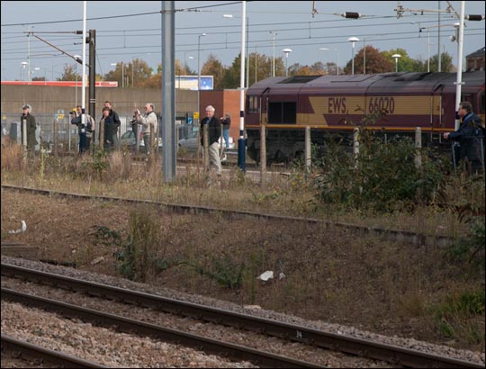 This is also a be for work started photo.Some railway photograthers wait on the old platform 3 waiting for steam at Peterborough with class 66020 in the background. The space for the new platform is yet to be built at the north end of platform 3 with the fast lines in the fourground.