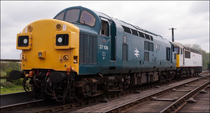 Class 56103 in Fertis colours in Wansford station with class 37109 in May 2013